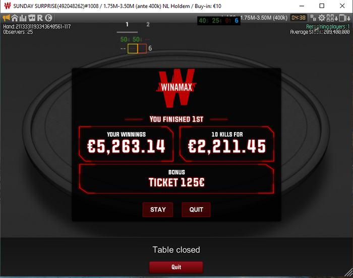 ♠ Простой водитель грузовика из Америки Дональд Нимне сорвал джекпот $250k в турнире Mystery Bounty в казино Wynn. Это необычный нокаут-турнир, где за выбивание игрока участники вытягивают конверты с призами. И Дональду очень повезло, так как выбив игрока ему выпал джекпот. Далее он ещё и в призы попал и добавил к своему выигрышу ещё $5,2k 💰