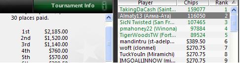 55 1р1а Холдем. Было 127, 86 ребаев, 77 аддонов. В призах 15. Иду 8 из 8. 9-ое уже 500 кажется.