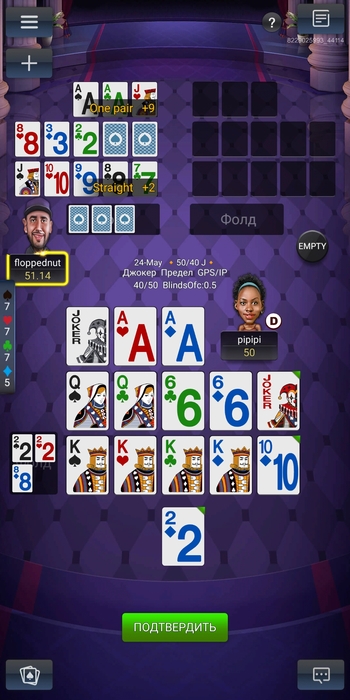 Играем прогрессив. У нас стартер условный 5, 2, 7 все кресты, 8 и дама пиковые. Как разложить правильно?