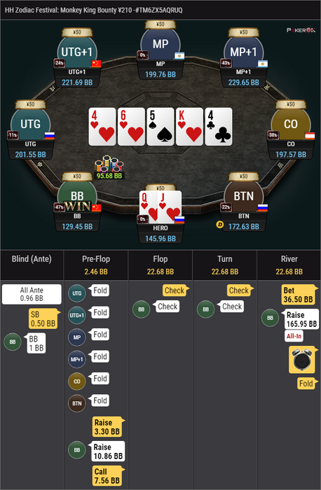 Интересный спот. С одной стороны, причины для блефа и для добора с рукой младше ему придумать сложно. У меня стриты, фуллы, флэши все есть, и я овербет ставлю. Ещё это баунти, и он понимает, что я его покрываю.