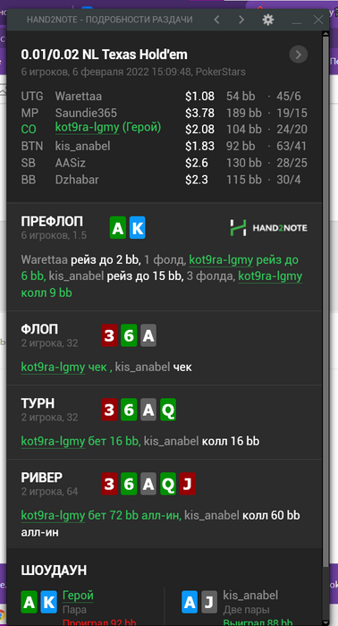 dibidibidis, Согласен, префлоп еще хромает, но я над этим работаю, еще много ошибок на кол 3 бета. за то что он вколил А4s это не первый раз, несколько раздач ранее он вколил мой пуш AKs с АJо. Я думаю что я плюсово запушил, но то что диспу сам увеличиваю это может и минус большой.