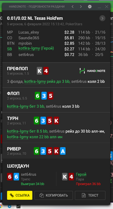 Поднимай кол-во раздач в день. Я понимаю ты бываешь после суток, завтра рабочий, у меня все тоже самое, я могу ходить как сутки через сутки, так и сутки через двое: сутки наряд, сутки отсыпной, потом рабочий до 5 вечера. А могу сутки работать, сутки отсыпной и так месяц. Но я все равно наигрываю от 2-3к раздач даже после суток в день. Наиграешь допустим 1,5к рук в день, если разбираешь, то хорошо, но я ещё делаю потом скрины и кидаю в телегу, а на работе по свободке разбираю. В начале сессии делай перерыв я рейз условных 10-15-30 минут. Для себя усвоил, что поначалу сессии меньше столов и меньше игры сразу, что бы уменьшить слив. Симпл, не могу ничего сказать по поводу него, еквилаба с головой хватит для нароботки что открывать в какой диапазон, поставь настройки, что бы тебе показывало открытие впип/пфр, 3бет, фолд на 3бет, открытие позиций, и фолд с Баттона в бб, сб и с СБ в ББ. Для начала хватит. И работаешь защет этого в еквилабе, у чувака открытие 15% на МП1, вбиваешь в еквалаб 15%открытие и твою руку, допустим 99 и смотришь сколько процентов, все, что больше 52%-играй. Чувак тебя 3бетнул со статой 9% 3бет, у тебя допустим одномастные КJ, они там где-то 45% будут стоять против его диапазона, значит фолдишь, все просто. Дальше прописываешь майнинг рук и покупаешь майнинг на месяц, старзы, допустим нл5 стоит 7$на месяц, большое преимущество тебе даёт, так как кол-во раздач даётинфу насколько он часто филдит на 3бет, защет этого ты можешь расширять 3бет в этого типа, ах да, фолд на контбет на флопе, тож первостепенная стата. Вроде все. Для начала все это тебе надо для начала.