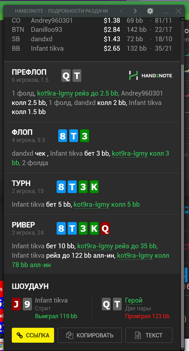 Мало очень рук, пока только вспоминаю АБЦ покер. Вчера было совсем печально, скинул другу график, сказал что много колирую не нужные ставки, сегодня стал играть более тайтовее, меньше колоть, и думать какой диапазон может быть у оппа. Сегодня хочу выучить ренджи 3 бета со всех поз.
