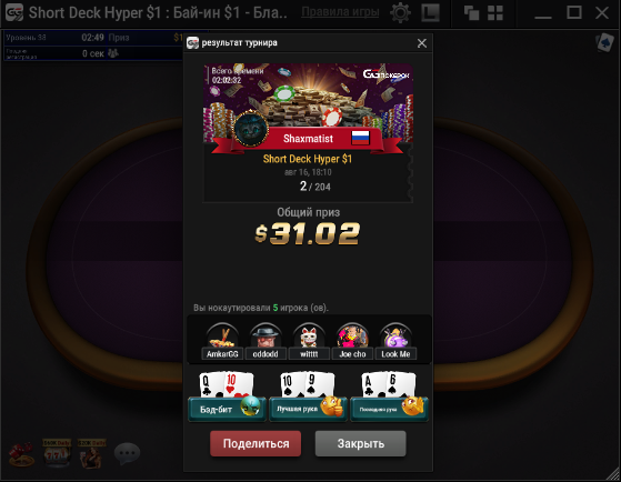 Был довольно интересный и довольно сложный. В какой то момент в кассе было почти 0 но как всегда пару турниров все вытащили. У меня назревает один вопрос GGPokerOk когда ты уже начнешь отдавать?! Как то все напрягает когда ты выставляешься сверху и тебя постоянно перезжат, ну или опп собирает свою комбу из 4 карт на столе на котором 5 карт. Вообщем не унываем работаем.