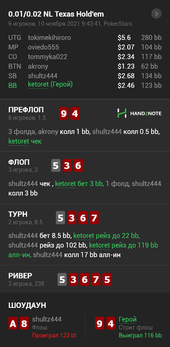 Без ошибок в первый же день, естественно, не обошлось. Придумать себе QQ, кольнуть, потом вспомнить, что это мультивэй, посмотреть на VPIP/PFR и увидеть 14/6.
