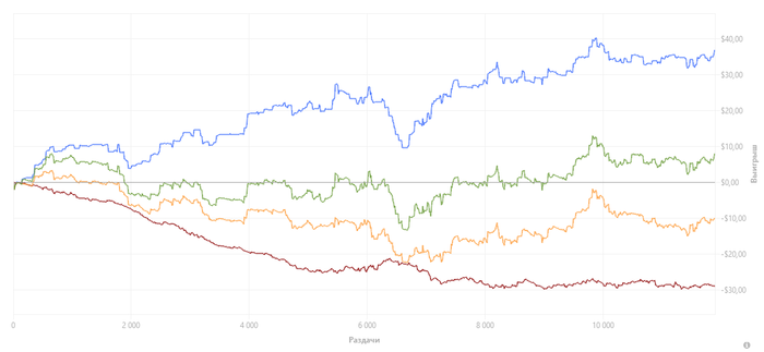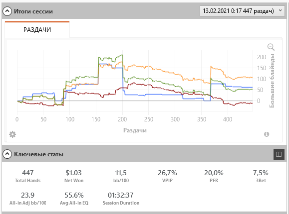 Карты весь день заходили не очень. Или не очень заходили. Но это покер, диспа, посредственные скиллы и прочее-прочее... В общем, как бы я ни старался, но день все равно закончил "в плюсе" (по БР)
