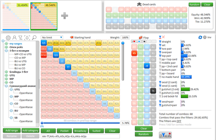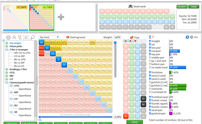 Идем дальше, поляна. Тут подробно не буду расписывать, а просто приложу скрин с выставлением на префлопе.
