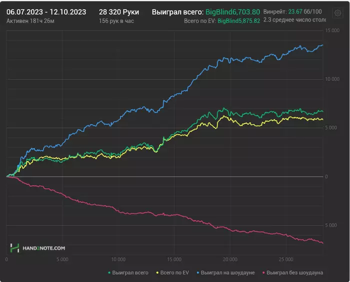 Рейк без кепки 5%. Победитель платит рейк за весь стол. Если вы выигрываете чаще остальных, то РБ будет выше. Не думал, что в 2023 есть такие поляны. О влиянии рейка пока тяжело что то сказать, его влияние будет видно на дистанции. Кажется, что можно держать минимальный винрейт, а профит иметь чисто с РБ. Буду тестить и держать в курсе.