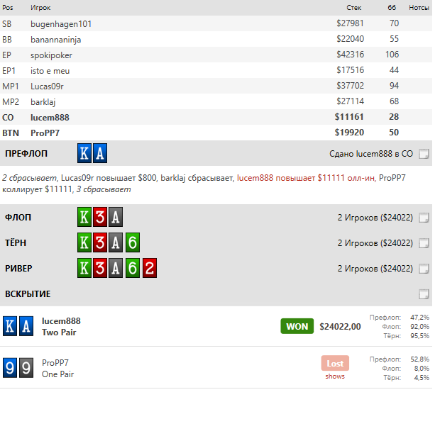 А и ещё: опп мог сыграть КК слоуплей, инфы нет на него и отбросить вариант не можем, остальные пары типо QQ и TT оппонент играет по фишарски при хорошем бете.