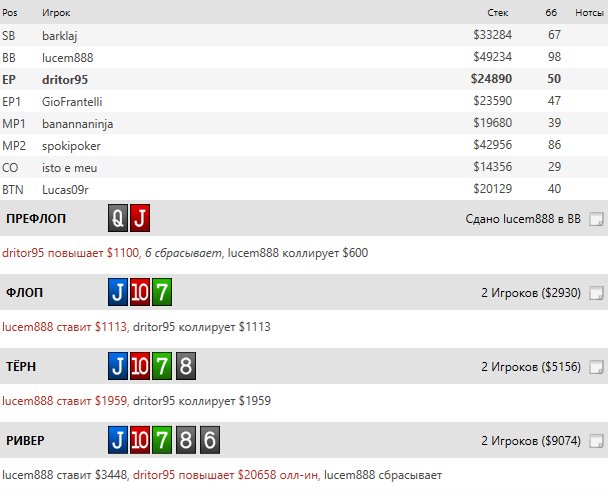 На ривере доехало бубновое, но они у тебя, тут мы ставим и получаем олл-ин. Либо промазанное дро с королем, либо флеш, и если он старший, то мы проиграли с ошибкой на флопе, а если выйграли - помечаем оппа фишом.