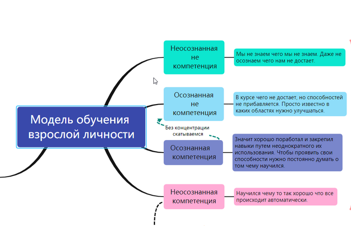 Когда же потом дополнительные условия уходят, наступает анализ, тогда опять создаем эти "нейронный мзменения", чтобы закрепить их на уровне "осознанной компетенции" начиная с того уровня, с которого у нас это закреплено: