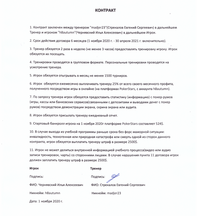 - контракт не был подписан и даже распечатан. Все было на устных договорённостям. В начале сотрудничества мною было озвучено,что так как работаю 2/2 не смогу откатывать дистанцию в 1.5 турниров одновременно. На что ответ был: старайся наигрывать больше в выходные дни.