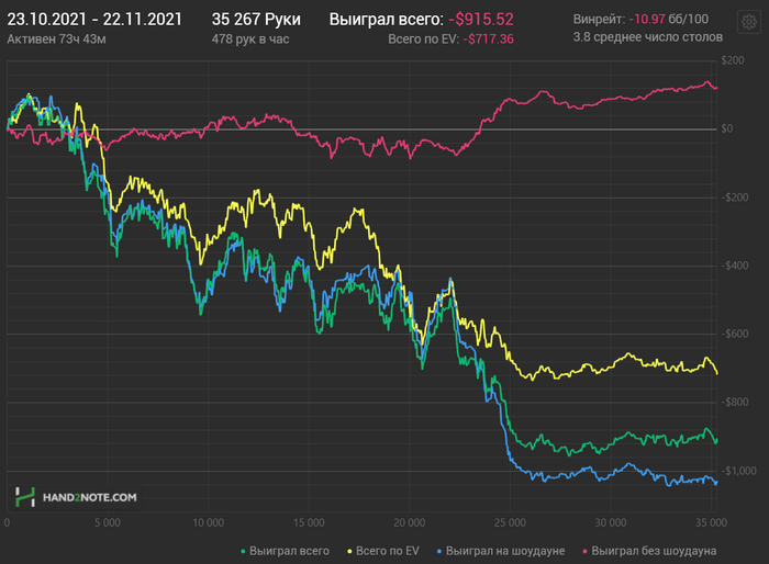 ZhenaBomzha, Спасибо тебе за ответ, но тут двоякая история, как бы со стороны кажется что да, я только с натсами играю, хотя вроде это не так . Про блайнды тоже думал, но СТАРАЛСЯ) активно их защищать. Еще кстати тоже вчера удивился, когда делал скрин, чтоб тебе сюда в блог закниуть на счет своих стат, они утайтились еще хотя я играл в зум где то 20/18/8 в среднем (может потому что я с СО убрал гапперы вообше так как они на большой дистанции в плюс не выводтся, но может и выводятся только пока не с моим уровнем знаний) ), на рег столах у меня где то примерно 23/20/10