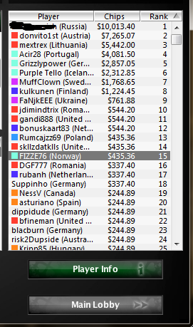 Потом был турнир. Играл я только ME. Вообще, я впервые играл двухдневный турнир. Был разумеется мандраж, но сумев адаптироваться, закончил 1-ый день в чиплидерах. А во второй день все сразу не сложилось. Проспал. Не позавтракал. Не смог дозвониться до родных. Опрокинул стакан с водой и перед перерывом проиграл АКс<1010 на стэк. Вот и все =)