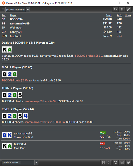 BSOD094, мне кажется ты перемудрил) Твой сайзинг по флопу это сигнал того что ты ставишь весь рендж, даже блефы с А5.