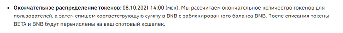 это я понял, потом я у меня бнб лочаться на некоторое время, и идет распределние токенов BETA, и возвращаются bnb. И как я понял в ближайшее время будет листинг этого токена на бирже?