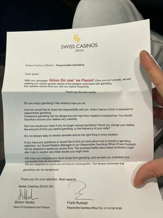 В общем в Швейцарии есть какое-то правило, что казино должно защищать людей от лудо мании, так как это может быть болезнью. В казино была одна русскоговорящая девушки спросил у нее за это письмо, и она сказала что если я продолжу так часто ходить, примерно на сороковой день, меня уведут на допрос, где у меня буду оценивать мое психологическое состояние, будут спрашивать есть ли у меня жена, дети и т д, И чтобы продолжить играть так часто, мне нужно будет показать на своем банковском счету минимум 50к€. Либо блек лист.