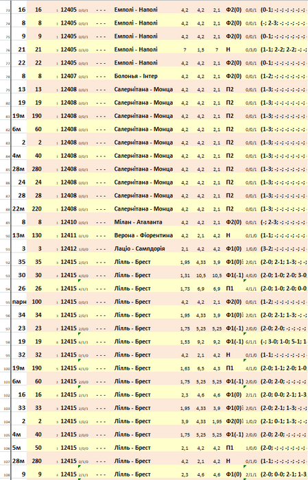 F (1) : (в основной таблице в зеленоватых клетках, под профитом, кое-где указывается возможный профит таблицы с использованием отбора матчей с наиболее выгодным диапазоном коэффициентов, из архива отобранных матчей с любым кф).