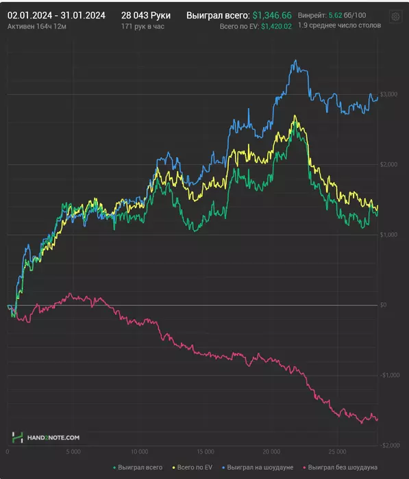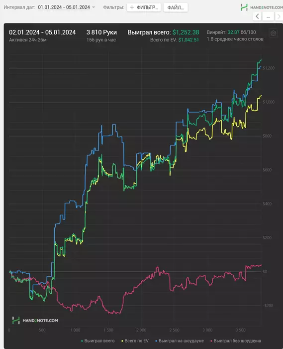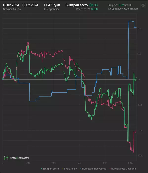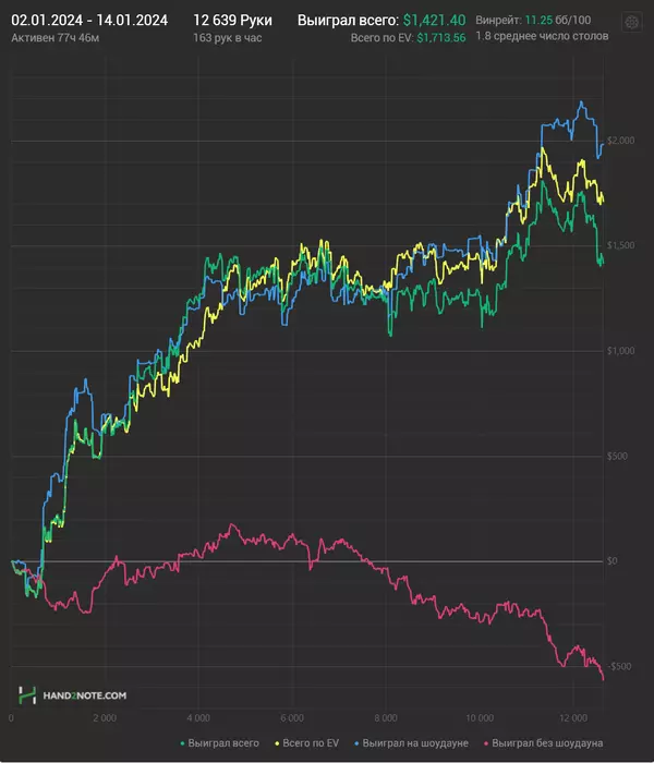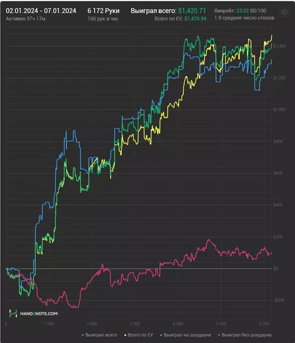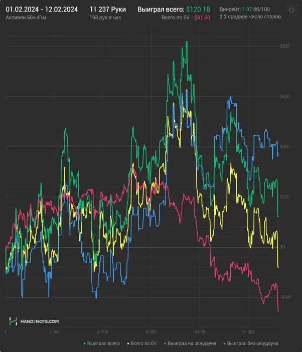 Околонулевой денек получился, к сожалению. Удалось отыграть почти 1.3к рук, 7 часов игры гдето.