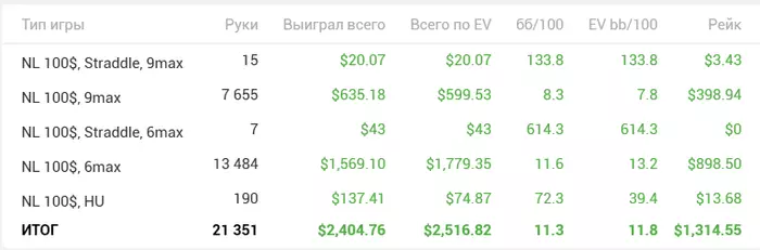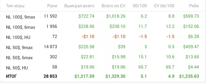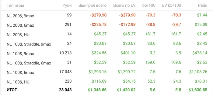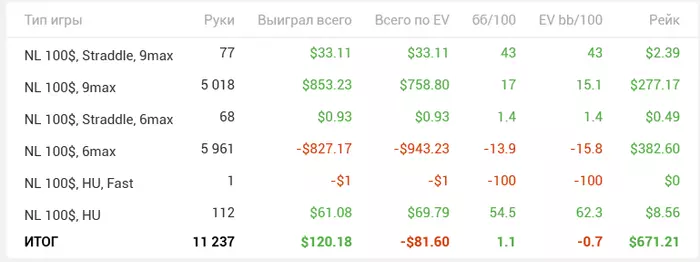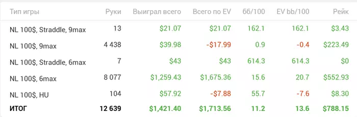 Закончил эту покерную неделю, правда результаты странные. По ощущениям не везло прям, только вконце вроде отмазал минус, по ощущениям было гдет -100-200. Оказалось +100 и еще 10 бб/100 показывает, удивительно конечно, как залив на верхнем лимите и ап на нижнем, могут дать такой низкий результат, с таким высоким винрейтом🤪