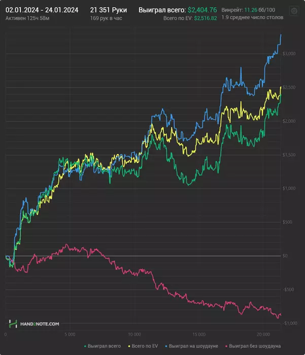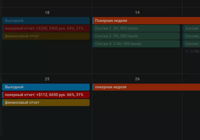 Отыграл 3 сессии, с 7 до 9, с 9:30 до 11:30 и вечером с 18:30 до 21:00 по местному времени. Игра шла хорошо, в плюс, правда на полтосе хорошо стеки забирал, на сотке подзалил, сделал одну грубую ошибку, видимо набрался черезмерной уверенности и легкомысленно кольнул пуш, не обдумав ситуацию получше. Удалось отыграть 1250 рук за день, что больше чем последние несколько дней процентов на 25, явно изза концентрации. Планирую в дальнейшем примерно такого же графика придерживаться. Теперь самое главное сохранять мотивацию и не расслабляться, впереди рыбные дни.