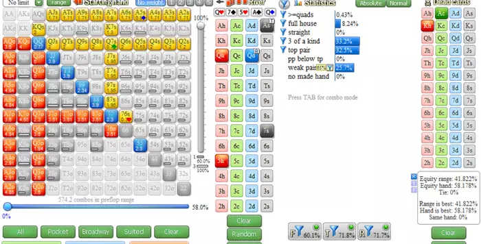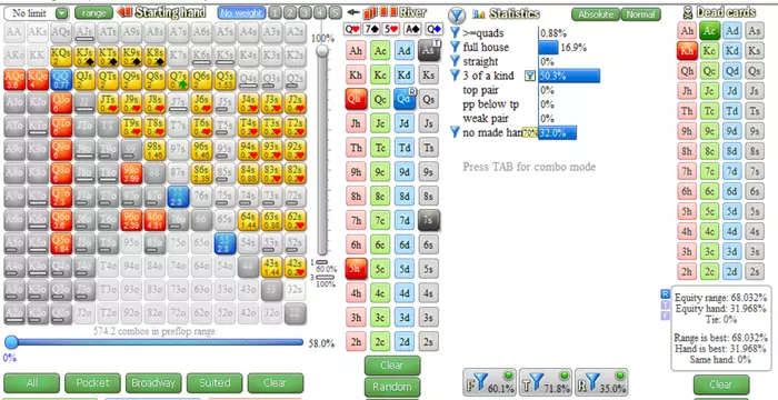 Сегодня вечером было свободное время, чтобы потеоретизировать, и посерфить во флопзилле. В последнее время делаю полную переработку игры без позиции, так как это слабое место у меня, где винрейты посредственные. Сегодня 3бет поты без позиции крутил во флопзилле, вбивал разные флопы и смотрел на эквити спектра, также смотрел какие раны терна понижают эквити, какие больше подходят нам. Основная проблема вообще недостаточная агрессия, и велью и блефов. И в основном это терн. Сейчас конкретно работаю над терном. Так как больше всего непонимания именно там.