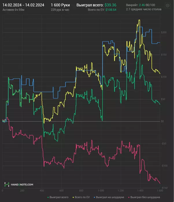 Сегодня было неплохо на полях, мультитейблил по 6-8 столов, удалось за 5 часов игры 1600 рук наиграть. Результаты тоже казались перспективными, но в итоге все опять скатилось к близко нулю. Печально после такой плотной сессии с фишами видеть такой скромный результат (точнее его отсутствие).