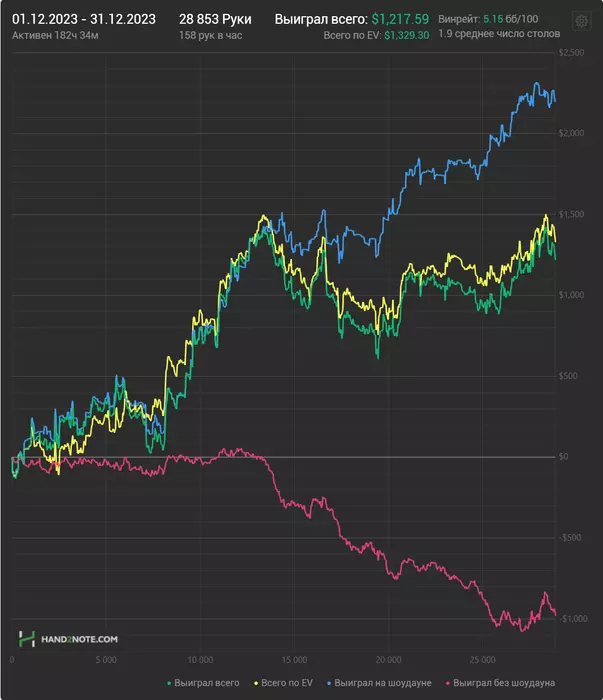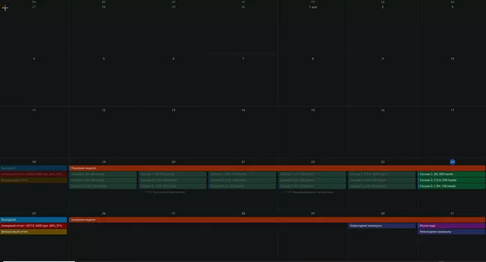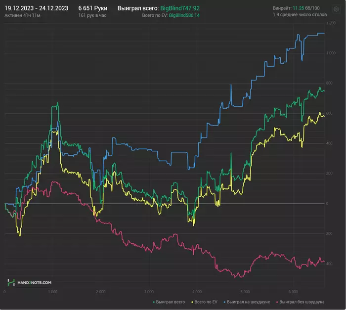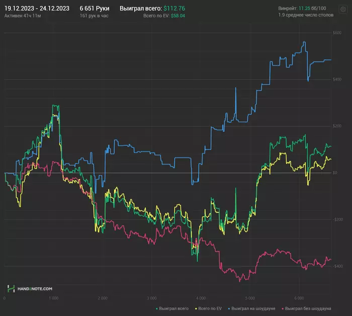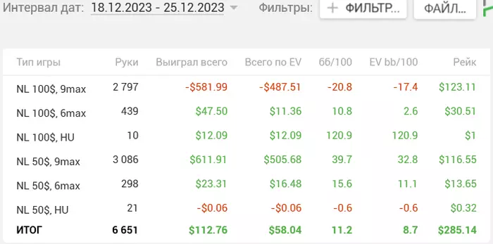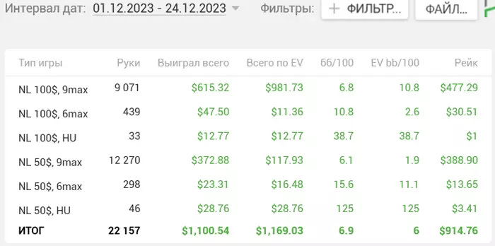 Для начала, декабрь отыграл нормально. Первый нормальный месяц, выхожу из стрика. Вчера начал добавлять столики 6-макс во время нехватки столов, сейчас и вовсе вернулся к онли нл100, так как если я сейчас поймаю положительный виток дисперсии, то на 6-максе я могу намного сильнее бустануть банкролл, да и рыбные дни сейчас.