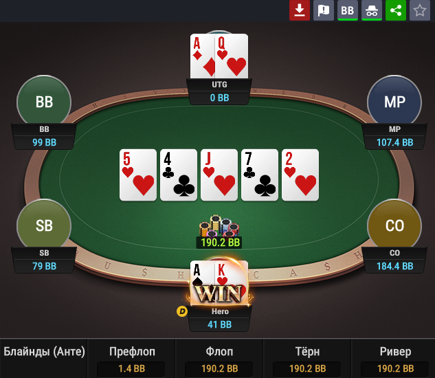 dibidibidis, а зачем вообще на микро играть 4bet с AJs? Понятно, что это плюсовый 4bet по гто. Однако, во-первых, ты играешь не против солвера, а, во-вторых, ты отыграешь эту руку сильно хуже солвера. Просто играй QQ+, KK+ 4bet ренж и все. В любом случае, никто не сможет тебя эксплойтить, если ты не 4bet в блеф (на микро)
