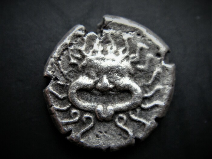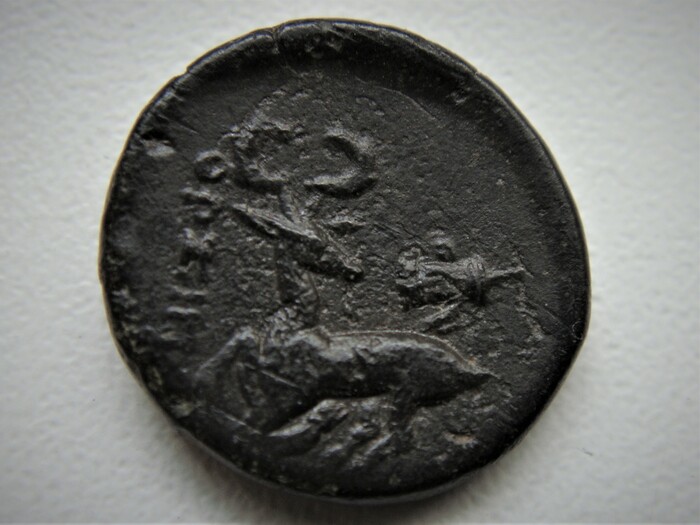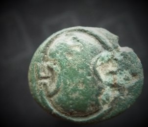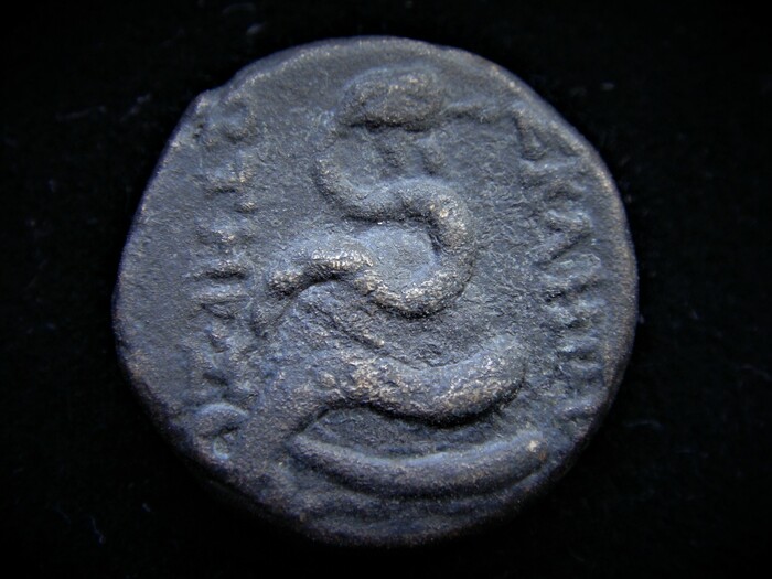 Аверс: голова бога врачевания Асклепия. Реверс: змея над священным камнем "пупом Земли", надпись ΑΣΚΛΗΠΙΟΥ ΣΩΤΗΡΟΣ (Асклепий Спаситель)