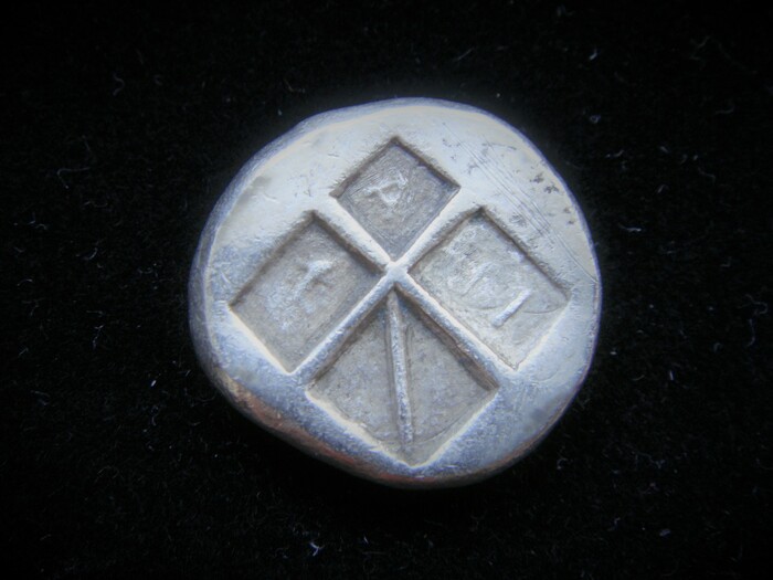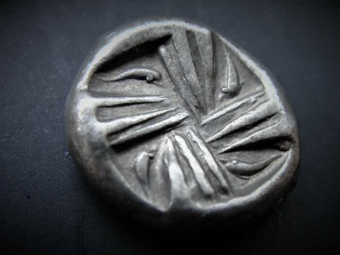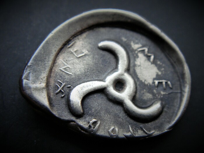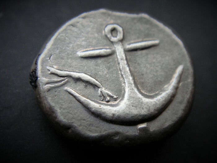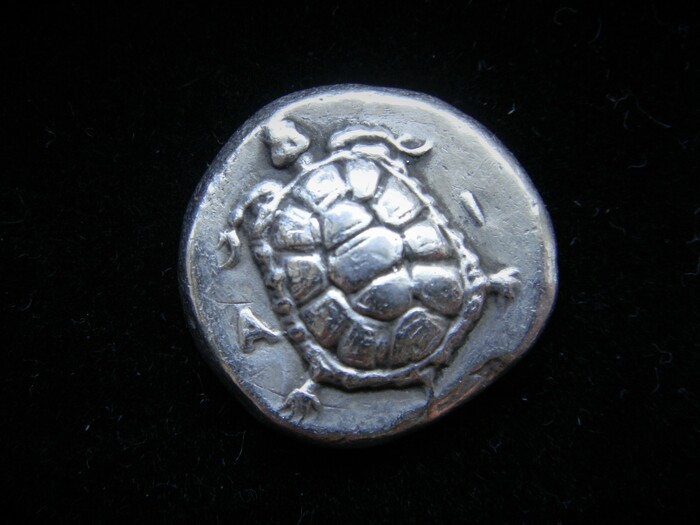 Изначально на статерах Эгины чеканили морскую черепаху, как символ своего величия на морских просторах.. Но после поражения эгинян в войне с Афинами (455 г. до н.э.) афиняне потребовали полного уничтожения морского флота Эгины – основы морской торговли островитян и их пиратского промысла. Совершив эту непростую для себя миссию, эгиняне начали чеканить на монетах сухопутную черепаху, тем самым, как – будто сказав миру: «Когда мы были сильны на море, мы были подобны морским черепахам, а теперь мы стали сухопутными, но все-таки не перестали быть «черепахами».