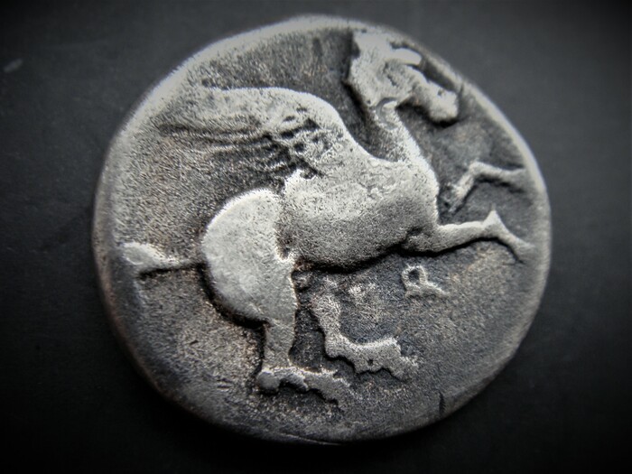 Пегас летит направо, /Голова Афины в коринфском шлеме