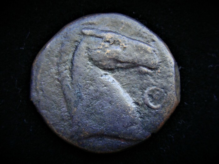 Беотийский щит; трезубец, дельфин, надпись -BOIΩTΩN-