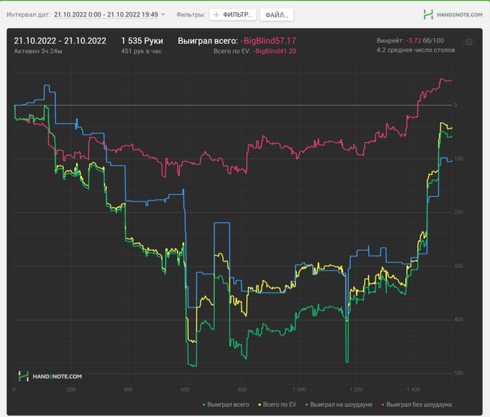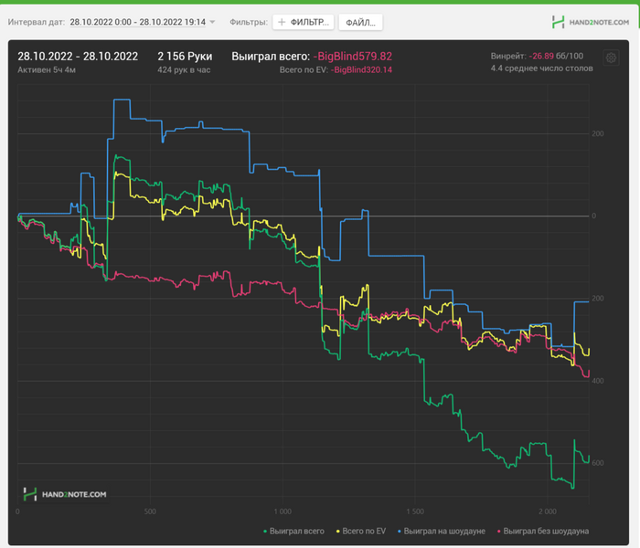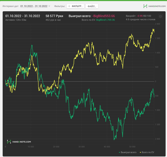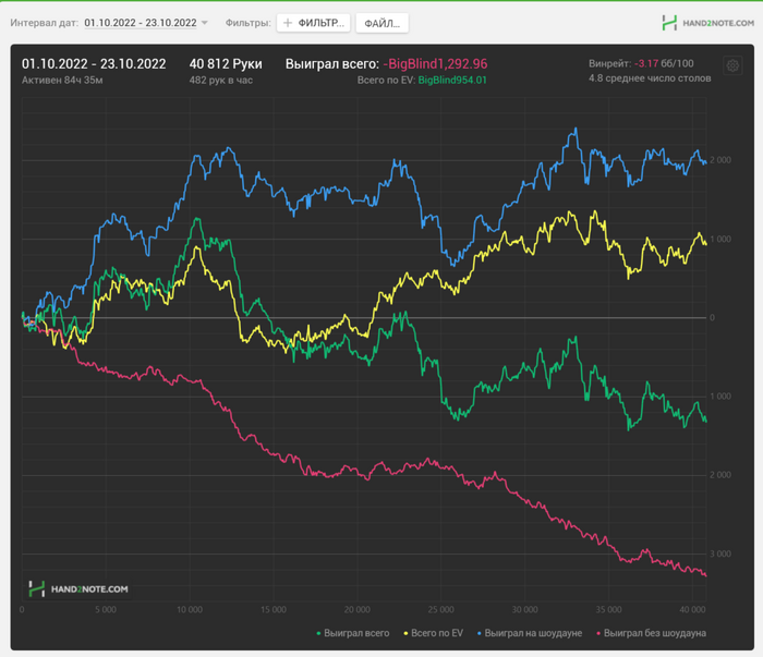 Недобираю в этом месяце уже 900 баксов, что составляет 1/2 от моего БРа. Хотя, на самом деле, от проигранных выставлений я вообще не тильтую или тильтую по минимуму. Ведь можно показать братикам желтую вверх и все скажут, что ты норм поцык, просто не складывается. А вот от чего меня прям карежит последние несколько дней, прям выворачивает, прям душу из меня достает, так это ранауты под 2%, меняющие натсы. Вроде тоже на это никак повлиять не могу, как и на префлоп выставления, но этого же на желтой не видно.