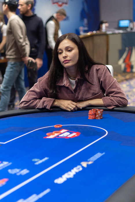 Стол 4. Зарина Кадыева была, пожалуй, чиплидером до этой большой раздачи. Она открылась 600 из UTG, Роман Щербаков уравнял на HJ, Максим Скиба на катоффе, Андрей Долгополов на баттоне, Дмитрий Шумейко на SB, а Роман Колотюк с ВВ сыграл сквиз 4,600. Кадыева, Долгополов и Шумейко нажали колл.