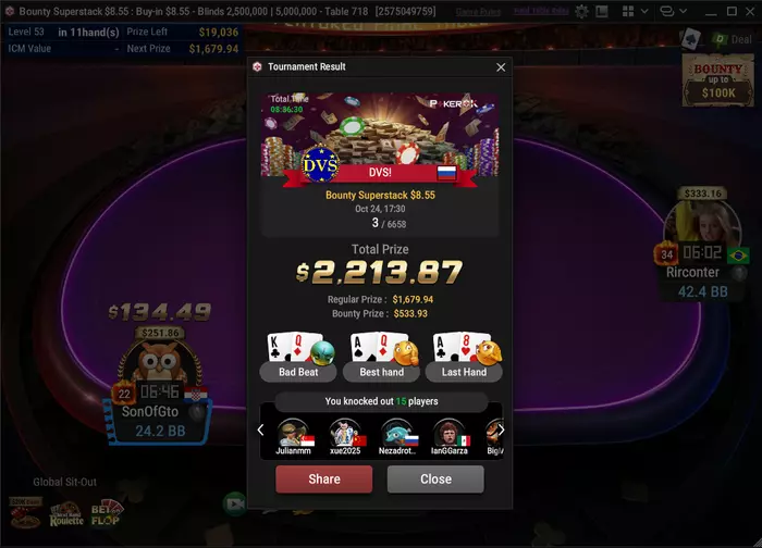 В топ-20 оставался со стеком 3бб, но выжил, на финалку выходил 8м из 9ти, оставался с 5бб, когда не вытащил AK vs 64 у поганого любителя, но не сдавался и дожил до ХА. Там уже до первого выставления при стеках 20бб, но пусть в след раз ха тащится :) Отличный резалт, главное теперь новый мейк не создавать 😎