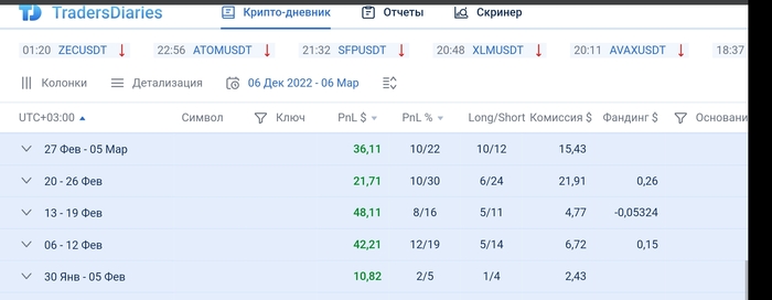 Слабенькие результаты, но плюс. Было примерно в два раза больше, но раздал на альтах на волатильности битка. Много тупых сделок. Надо стараться не отходить от своей системы. а то на эмоция часто покупаю хаи и продаю лои, а потом увеличение объемов + тильт.