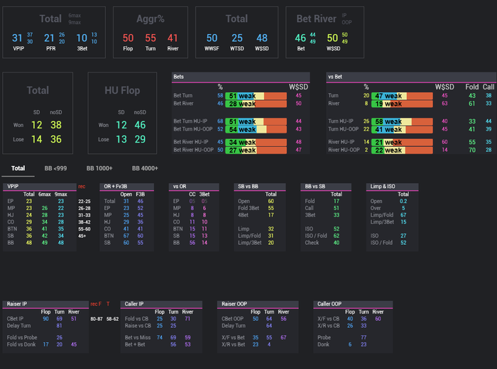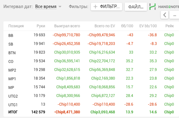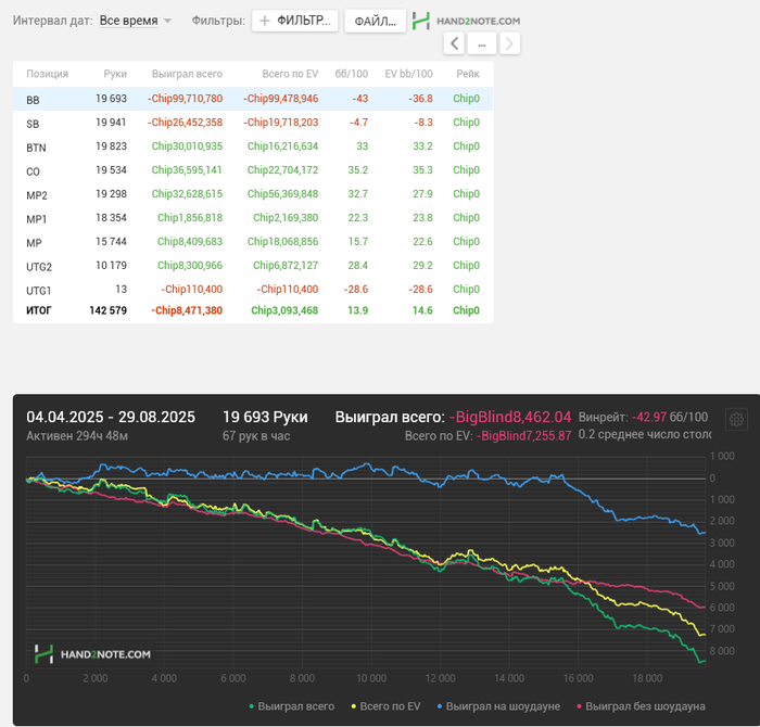 FroZer, хех, это даже не высоко, посмотри у Игоря тренера, там просто в космос летит, да и многих его учеников, можешь тоже в теме глянуть, просто я как написал, это немножко не мое, я все-таки, хоть как-то образно пытаюсь немножко защитить линии, а то прям некомфортно становится, если в линии какой-то нет натсов вообще,а с хорошими регами надо уметь и на газетах отпор давать)))) но вообще мое мнение по красной тут все вместе, но как будто постфлоп все-таки более важен, по поводу спотов не думаю, что какая-то загадка скорее всего решает рейзер в позе, думаю самый важный спот, т.к если обратил внимание, например защита бб у меня несколько просела, вообще конечно ближе к выбросу диспы, т.к вообще на всей дистанции держал в районе до -25, а тут скатилось, но на красную влияния не оказало, так же и сб просел чутка, до этого отрезка в околонуле держал, так что, думаю все таки игра в позе, статы вот общие, если какая-то конкретная нужна пиши, хотя вот глянул бб, тоже наверно решает защита, но т.к винрейт просел не предал особо значения