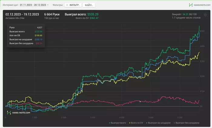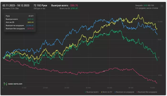 По сути, 3 месяца осени проходили хорошо. Я фармил монету, копил БР (медленно, но верно), делал "день теории" 1 раз в неделю с напарником, иногда работал с тренером, катал привычный лимит. Все это сопровождалось дикой апатией и грустью, ведь я основательно взялся за покер уже как 2 года, максимально быстро проскочив нл10, быстро закрепившись на 25-ке, на ней так и зависнув. Сначала я совмещал это с Департаментом и быстро копил Бр, потому что почти ничего не выводил, играл я посредственно, но даже тех знаний хватало, чтобы играть в 3-4бб и копить. Потом, я ушел полностью в покер, где за год, что я в нем - прошел путь от чела с БР 3к с посредственными знаниями, до чела с ВР 6-7бб (янв-май 9бб, лето 3бб, осень 8бб), все так же посредственным селектом и телефонией, хотя, работая с тренером, нивелировал ту слабую сторону своего подхода очень сильно прокачавшись в теории и пережитых стриках (которые были следствием моей все равно средней игры и плохого рана), все так же мне плохо сдавали на 50, я не мог там закрепиться, у меня не было БР шотать чаще, были высокие траты, что меня в итоге окончательно и добило. Я думал, что моего винрейта хватит, чтобы наживать без боли и потихоченку фармить на шот, но ТРАТЫ....это моя основная проблема. Дистанция\почасовка спасали эту ситуацию, но глобально я был близок к краху каждый месяц, Бр был в районе 2к, что вроде бы ок, но мои траты были в районе 1к, часто - даже чуть выше, где мог быть один недобор и я погиб. Так и прозошло в декабре. Ноябрь закрыл в недобор 8БИ, плюсанул на 900$, что с моими тратами все равно отрицательно, но не критично, а вот в декабре я пожрал основательно.