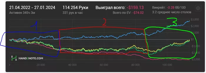 2. Я уже занимался с тренером, ран был таких же плохим, синяя не растет, но есть понимание, более глубокое: какие кнопки жать и где можно давить самому. Красная не падает так сильно. Для меня это говорило о том, что начал сам давить в правильных местах. Хотя бы не лью, а играю в 0, что тогда казалось большим прогрессом! Ошибки все равно были, тут бесспорно, плюс продолжительность стрика влияет на меня все сильнее и я не чувствую себя комфортно. А потом свинг легкий, с моим БР, на тот момент, ощутимый. Я вообще не понимаю, когда это все закончится и закончится ли вовсе. Уже 90к рук отыграл, а синяя в плюсе на 10БИ.