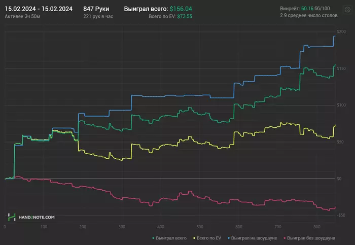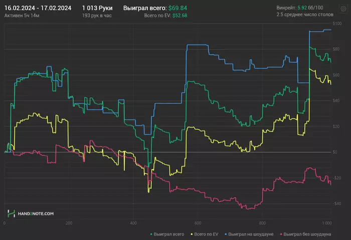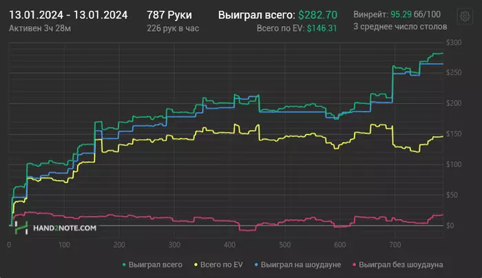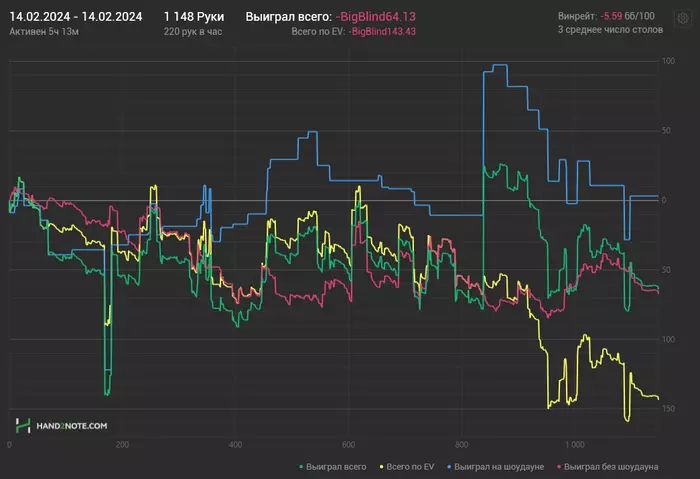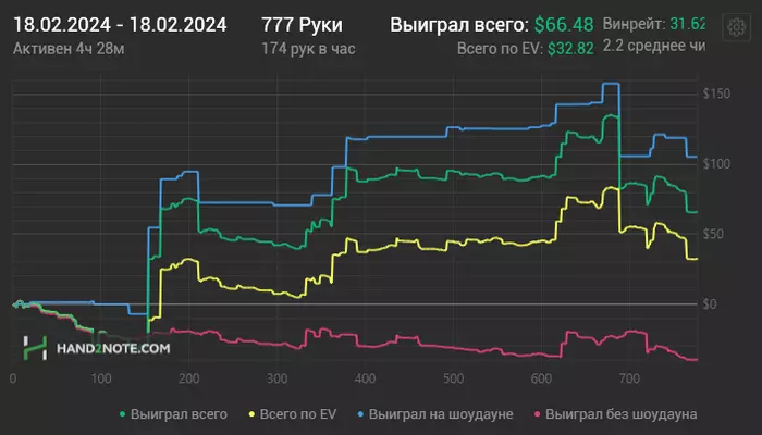 Третий день в плюс, могу ошибаться, не проверял, но мне кажется в первые с февраля я сыграл 3 плюсовых сессии подряд, чудо не иначе. В один момент уехал в дипах КК vs АА префлоп и приуныл, почувствовал, что реагирую на это острее чем обычно и чем нужно, спустя немного времени решил оффнуть. Менталка просела конечно, надо похилиться как то. И игры вчера было кот наплакал, ну камон 174 руки в час?