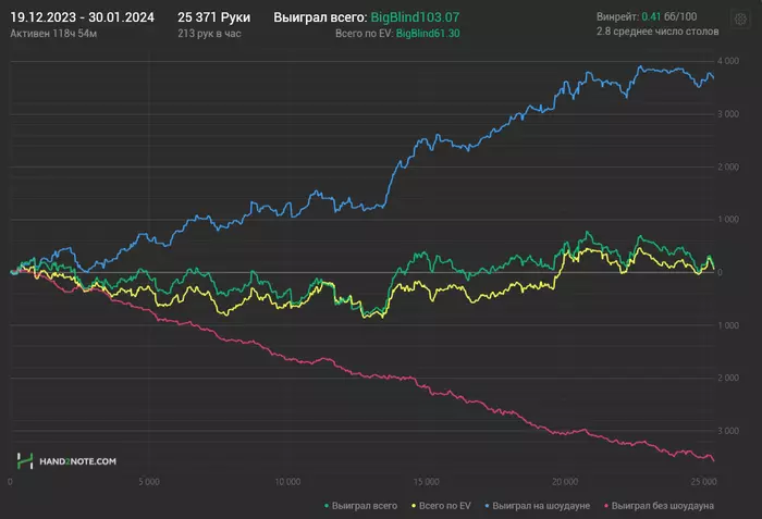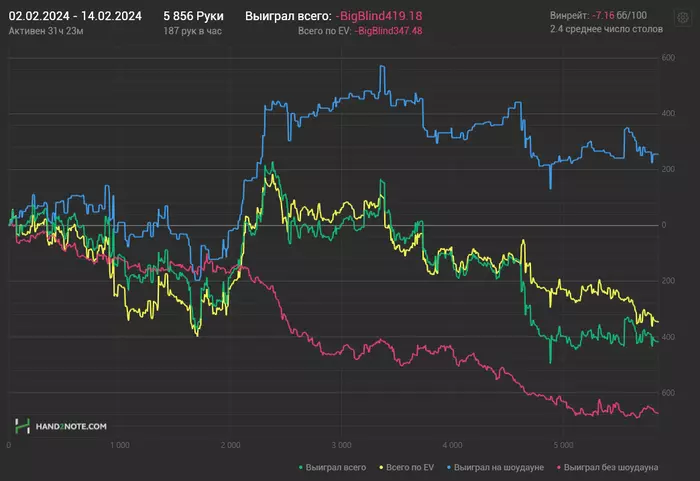 К этому я отношусь ответственно и когда я чувствую приближение неоптимального состояния, я просто выключаю игру, как следствие - 5856 рук за половину месяца, я просто бью все рекорды! Вот на это я точно могу повлиять да? Да могу же, только как? Я подумал над этим и решил, попробую максимально сместить фокус с результата (главное не заметить как стоп лосс пробил если такое будет). Так же хочу попробовать выкладывать результаты сессий КАЖДЫЙ РАЗ когда садился за столы, буду писать свои мысли, а может не буду, там как пойдет.