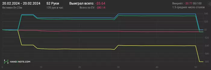 Не очень легкая игра была, как будто много лишних денег отдал в этой сессии, рвано и супер не стабильно. Половину сессии просто по черному лил по красной, а сделать ничего не могу, на блеф 3бет получаю 4бет, был 4бет в блеф, получил пуш в ответ, никуда не попадаю, из банков выбивают. Вот тут честно не понимаю или все ок, или я днище. На дистанции красная летит в дно, просто ужас