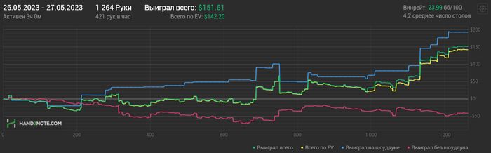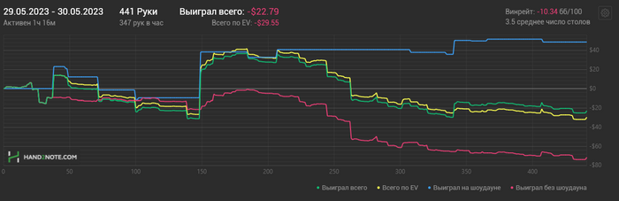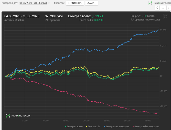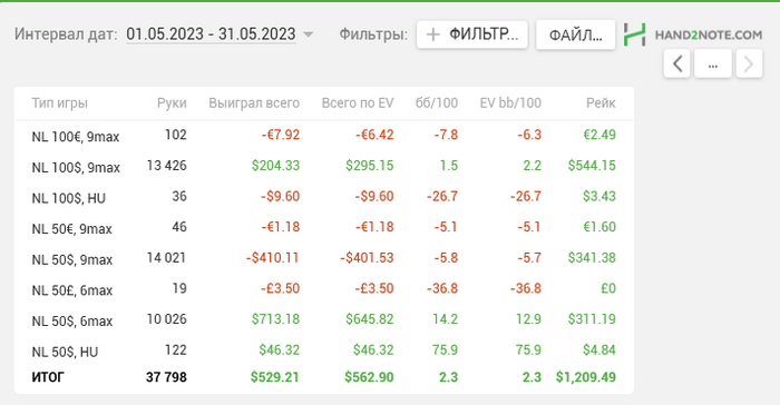 Главная боль, конечно, что не смог закрепиться на 100ке. В этом месяце принял решение катать 50ку, пока не будет винрейт >=6 бб/100. Плюс подключил еще 6 макс. Благо 6 макс встретил апчиком и надеюсь получится закрепиться в этой дисциплине.