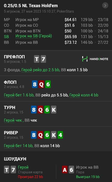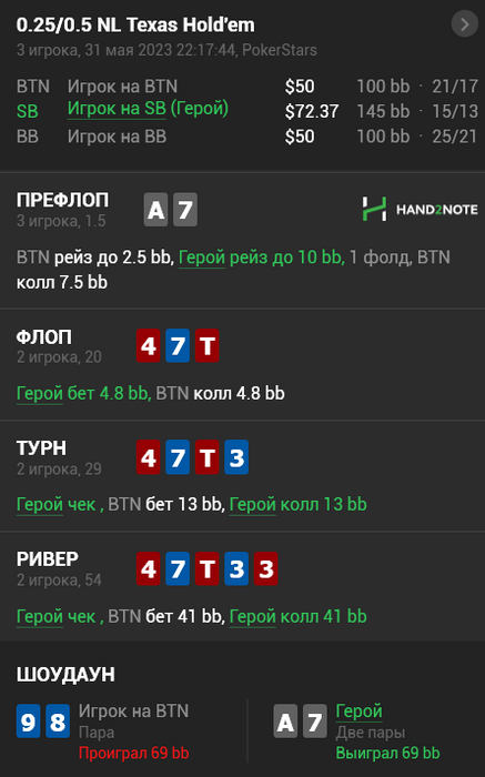 machetas @ 28.05.23По флопу пока всё таки не понял. Выбивает он по сути в основном руки хуже своей.