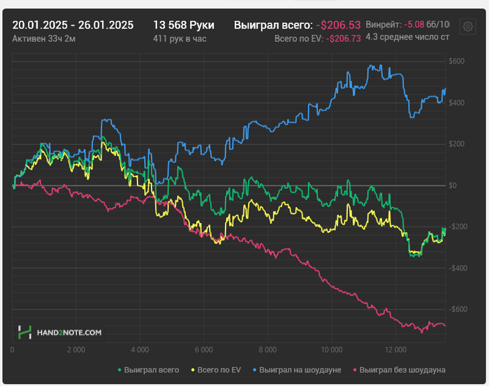 Три дня шота. иду скромно и с недодачей. Радует что блайнды защищаю довольно хорошо. На проваленных позициях все стандартно АК, QQ и прочие префлоп сравнения. Ничего криминального не сделал.