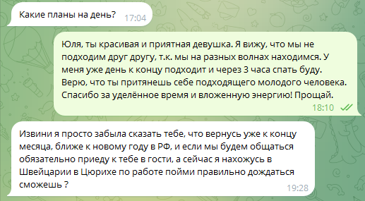 В итоге я в выходные пишу сообщение, что все, надо прекращать. И она ответила, мол ты погоди немного, я вообще не в Ростове, скоро закончу дела и могу приехать к тебе.