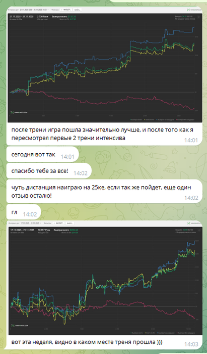Последнее время я стабильно помогаю людям находить их лики с помощью своего опыта, за счет того что много тренил в том числе бесплатно, формируется насмотренность. К каждому звонку отношусь индивидуально, я не помню, чтобы у меня трены с людьми были одинаковыми. Люди точно повышают свои лимиты и доходы после меня. Как минимум несколько людей точно поднялись с нл10 нл25-50 за последнее время. Пройдет время и я уверен они будут на нл100-200 играть.