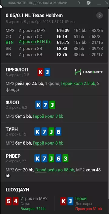 Слева по рандомайзеру сыграл,понимаю,что такой пуш выглядит не слишком уместно и можно сыграть 4-бет,но решил упростить себе жизнь.