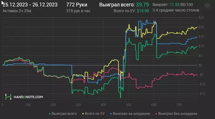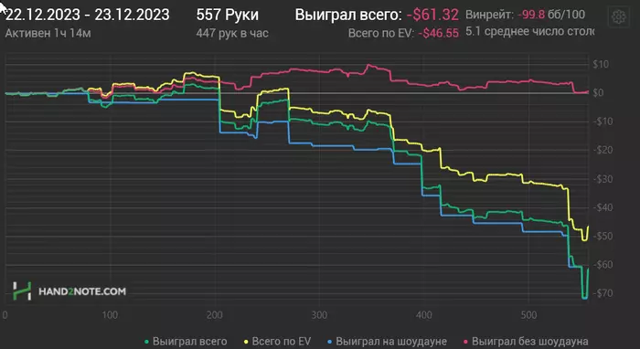 Наверное каждый,даже не следя за балансом,в уме примерно помнит (по крайней мере первую часть сессии),сколько стеков он сейчас на плюсе или минусе.Я отыграл примерно 500 раздач и в уме у меня было следущее:Проиграл на нл20 примерно на 6$ раздачу,но потом примерно столько же отбил.На нл 10 меня ривером по грязи ушатали в 4 аута на 6$ и был еще проигрыш бакса на 4...Ну лечу стек примерно.В этот момент срабатывает сигналка,машина на парковке у ТЦ и я понимаю,что надо отогнать,там решили чистить снег.